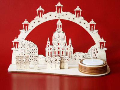 Die silhouettenhafte und detailverliebte Darstellung einer Stadt zeigt zum Beispiel bekannte Bauwerke wie z. B. den Dom St. Marien in Freiberg, die Frauenkirche in Dresden oder das Alte Rathaus in Leipzig. Dezent beleuchtet mit warmweißen LEDs, entsteht eine gemütliche, festliche Stimmung – ganz ohne Kitsch.